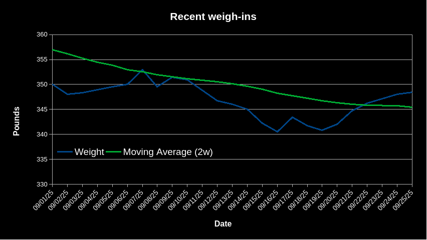 The last week has been a bit of a disaster. I was very excited to continue pushing towards the low 300s, but unfortunately I’ve hit a major setback. I have a wicked ear infection that has been causing me extreme amounts of pain. As such, I’ve essentially lost nearly all control over my eating habits. In a fit of restlessness, I recorded this update while coming up with a plan to bounce back from this. It is frustrating to lose all of September’s progress to this, but I’m taking it as a lesson in patience and perseverance.